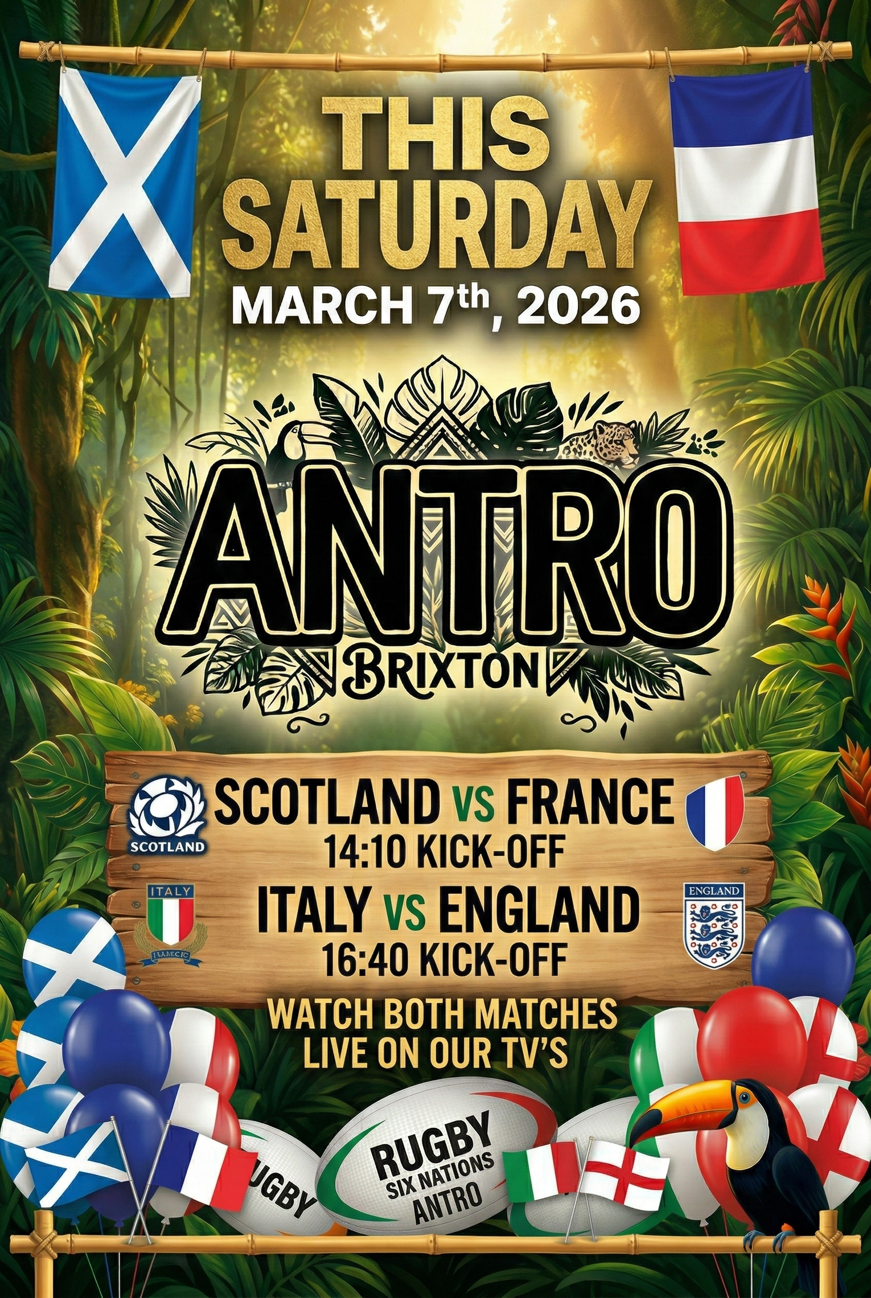 Settle in for a massive Saturday of Six Nations rugby! We’ve got a huge double-header lined up: catch Scotland vs France starting at 14:10, followed straight after by Italy vs England at 16:40. Two epic matches, ice-cold drinks, and the best jungle vibes in Brixton.